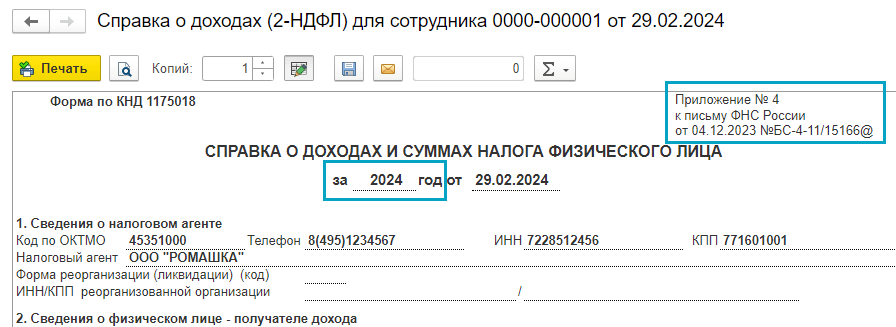 Справки о доходах для сотрудников за 2024 год печатаются по форме, рекомендуемой Письмом ФНС России от 04.12.2023 № БС-4-11/15166@.