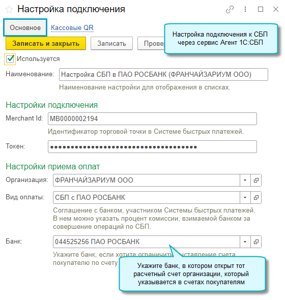 Рекомендуется указать банк в созданных ранее настройках подключения, если у организации открыты расчетные счета в нескольких банках, не поддерживающих подключение к СБП напрямую через 1С. При новом подключении через сервис Агент 1С:СБП - банк заполнится автоматически.