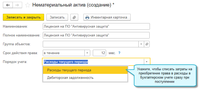Порядок учета затрат указывается в карточке нематериальных активов, которая теперь используется для всех прав, даже если они не признаются нематериальными активами.
