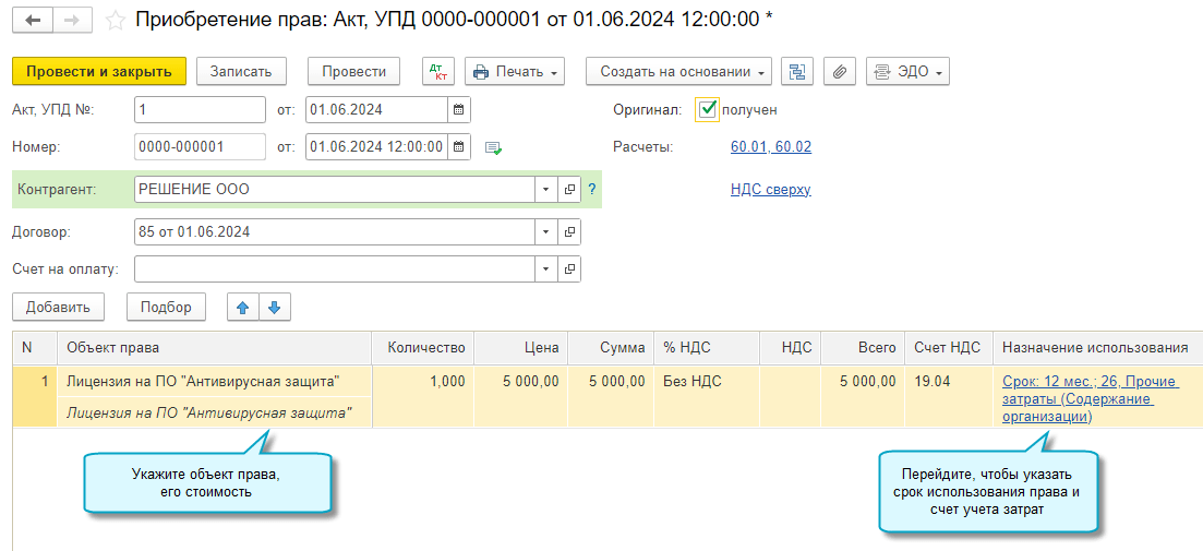 Для этого используйте документ Поступление (акт, накладная, УПД) с новым видом операции Права - Приобретение прав: акт, УПД.