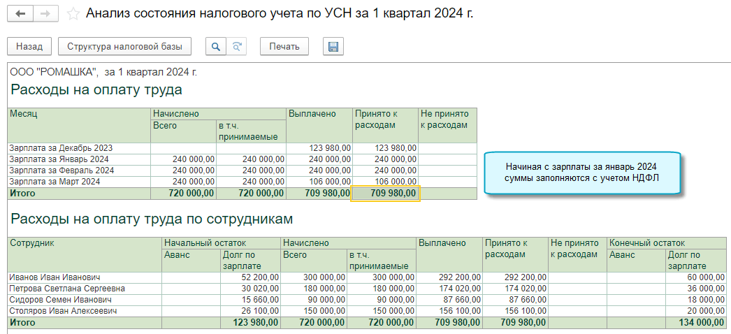 НДФЛ, удержанный с зарплаты сотрудников, учитывается теперь в составе расходов на оплату труда при УСН "доходы минус расходы". Начиная с 01.01.2024 в день выплаты зарплаты в расходы включается зарплата вместе с НДФЛ. Отдельно НДФЛ не учитывается в расходах (Письмо Минфина России от 01.06.2018 № 03-11-06/2/37590).