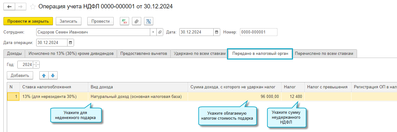 Добавлена возможность заполнить и передать в ФНС информацию о невозможности удержать НДФЛ при выдаче неденежного подарка.