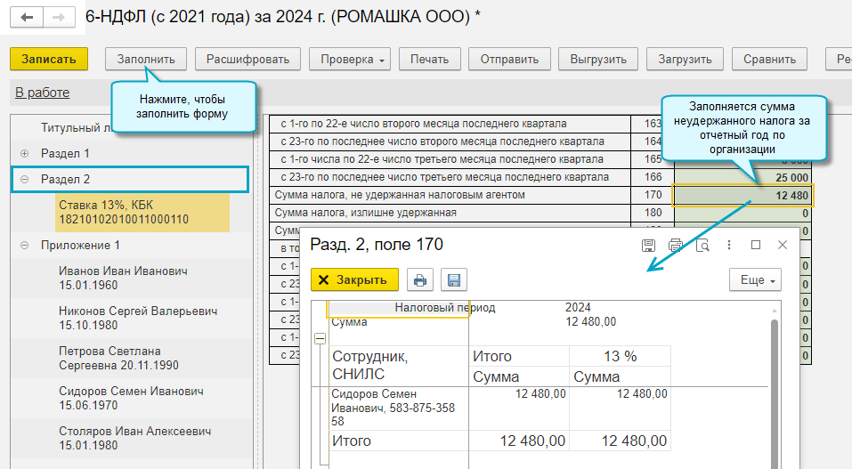 В расшифровки Расчета по страховым взносам, 6-НДФЛ и ЕФС-1 добавлен вывод СНИЛС сотрудников, чтобы различать полных тезок.