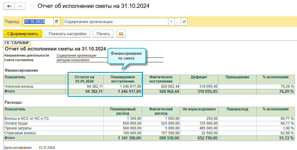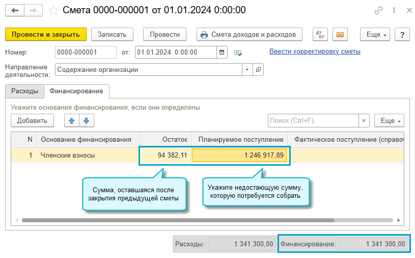 Теперь при составлении сметы учитывается сумма финансирования, оставшаяся после закрытия предыдущей сметы по направлению деятельности. Например, остаток членских взносов на содержание организации по итогам прошлого года заполняется в смете на текущий год.