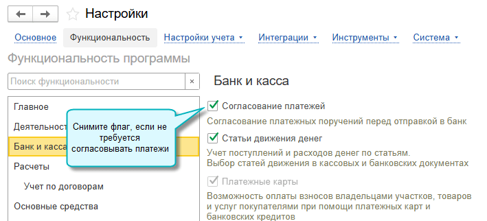 "Согласование платежей" включается автоматически при переходе на использование полной функциональности. Если не требуется согласовывать платежи перед их отправкой в банк, выключите эту функциональность.