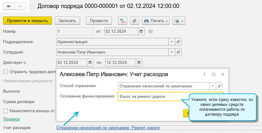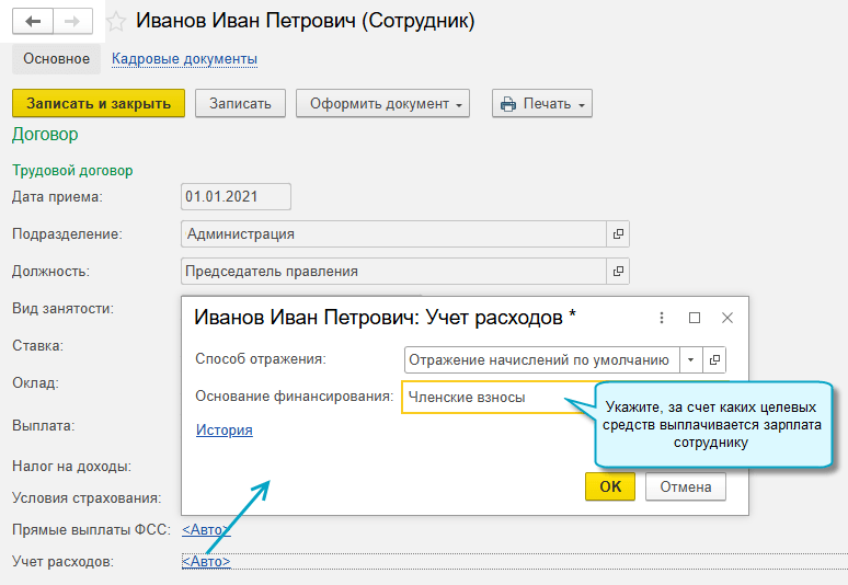 Когда основание финансирования заполняется по сотрудникам, можно указать в карточке сотрудника основание финансирования, которое часто по нему используется, чтобы оно заполнялось по умолчанию.
