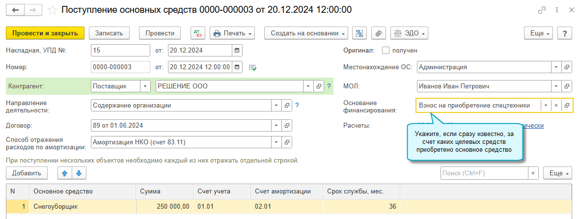 Добавлена возможность отражать использование целевых средств сразу при поступлении основных средств, когда известно, из каких целевых средств финансируется их приобретение. Для этого достаточно указать основание финансирования в документе Поступление основных средств.