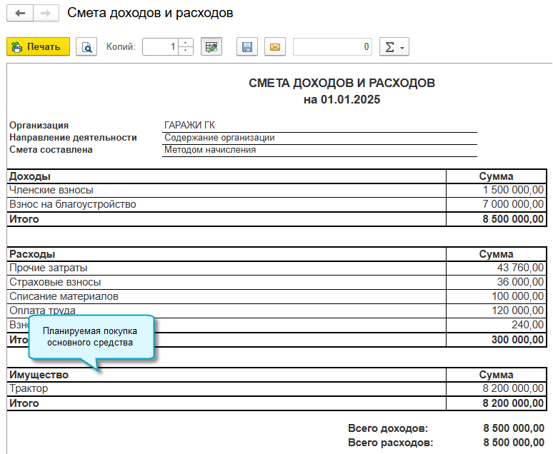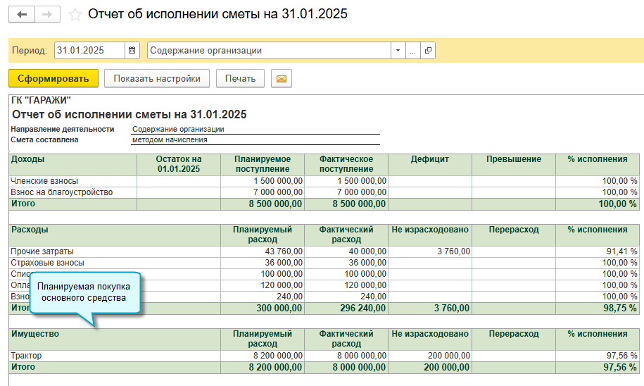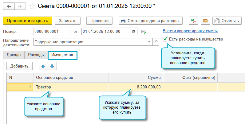 Добавлена возможность планировать расходы на покупку основных средств по смете, составленной методом начисления. Фактические расходы на приобретение основных средств отражаются в отчете об исполнении сметы.