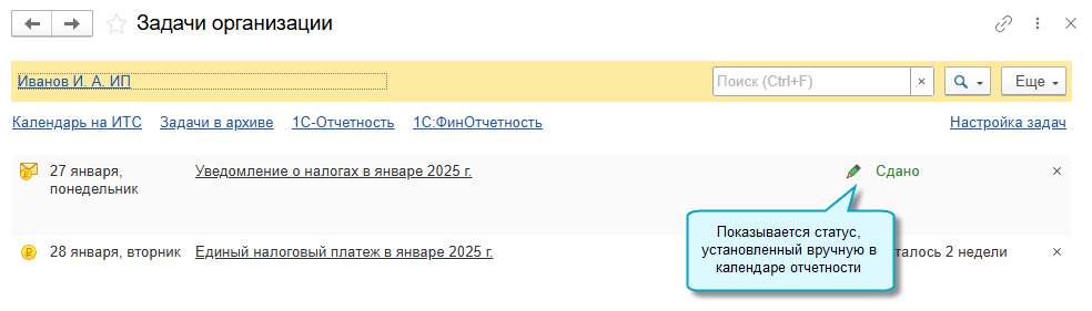 Если календарь отчетности формируется по нескольким приложениям сервиса 1С:Фреш, то данные об установленных статусах и комментарии передаются в приложения автоматически.