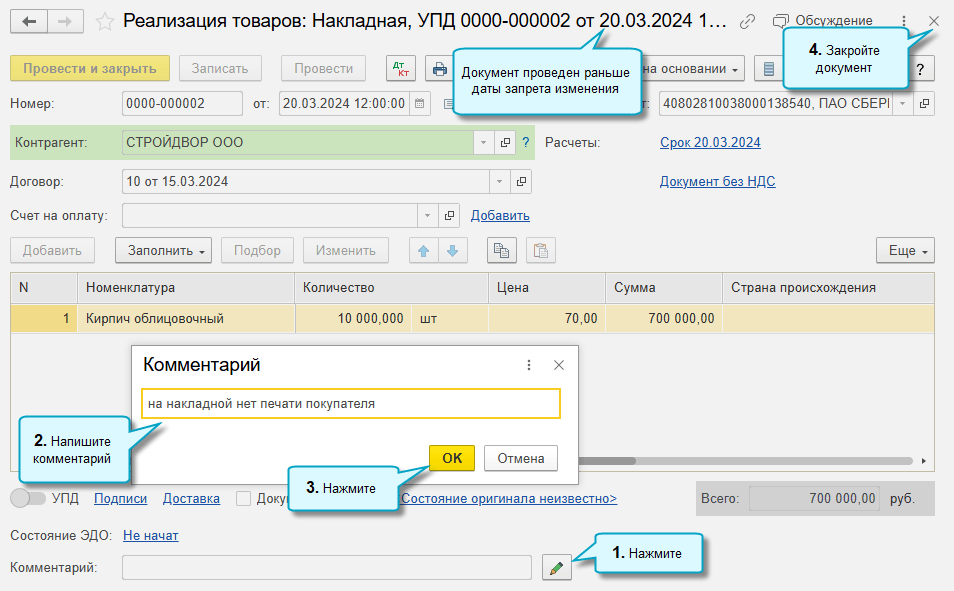 Добавлена возможность редактировать комментарии в документах, проведенных в закрытом периоде. Документы при этом не перепроводятся.