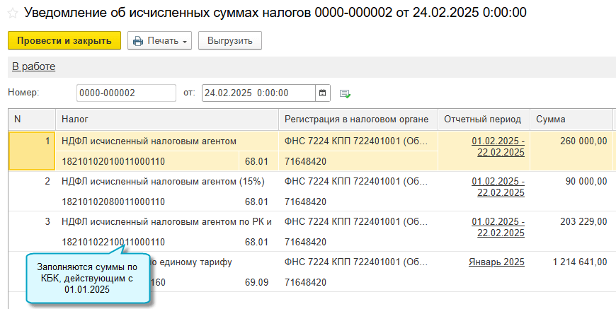Уведомления об исчисленных суммах налогов за 2025 год заполняются по КБК НДФЛ по ставкам 18, 20, 22 %, районным коэффициентам и северным надбавкам (Приказ Минфина России от 13.11.2024 № 165н).