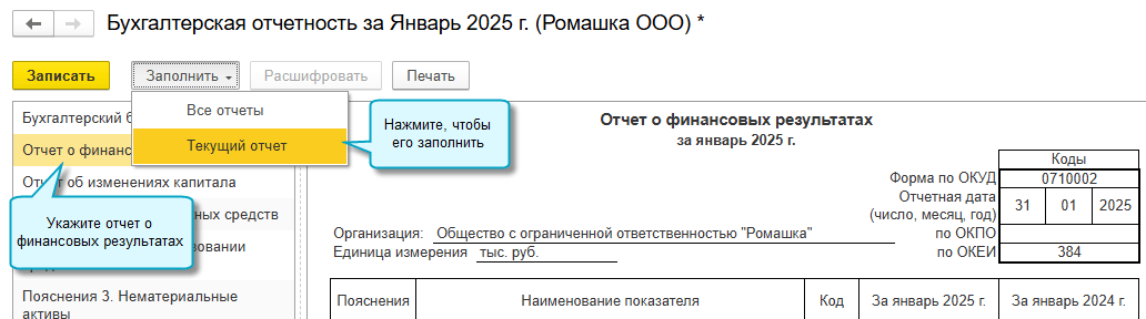 Добавлено автозаполнение отчета о финансовых результатах по форме, разработанной на основе образца, приведенного в ФСБУ 4/2023 "Бухгалтерская (финансовая) отчетность". Применяется такая форма начиная с отчетности за 2025 год.