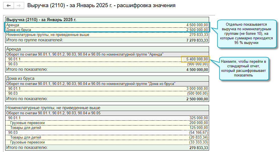 По выручке и себестоимости продаж выводятся отдельные показатели по номенклатурным группам, суммарная доля выручки которых составляет не менее 95%.