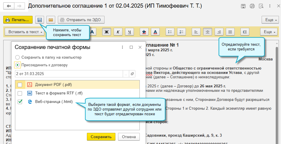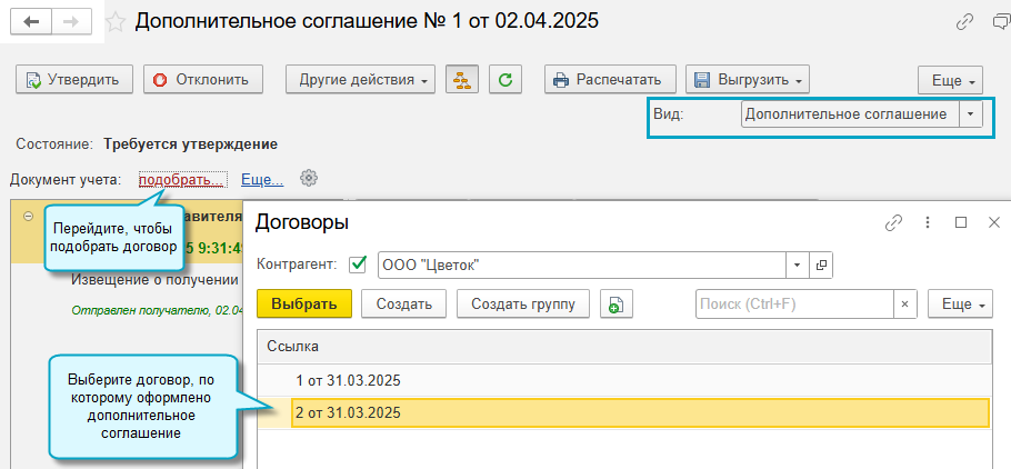 При получении дополнительного соглашения по ЭДО, требуется его связать с договором. Для этого выполните следующее