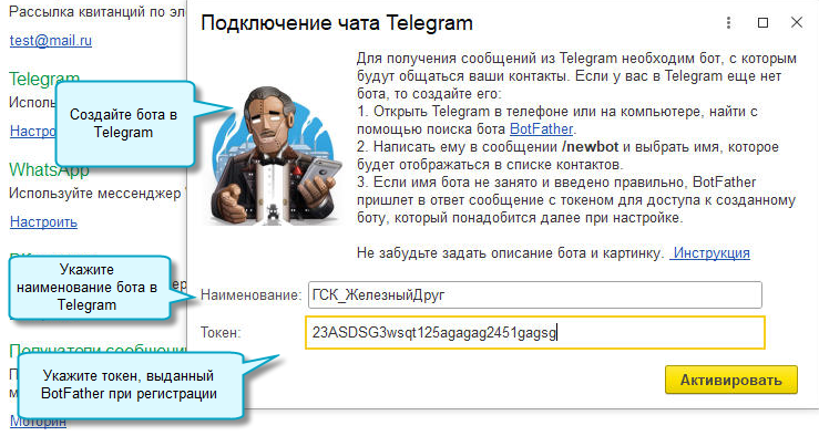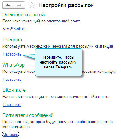 Рассмотрим на примере Telegram. Подробнее о рассылке квитанций через Telegram, WhatsApp и ВКонтакте см. в Статье.