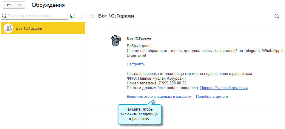 После подтверждения данных в Обсуждениях у получателей сообщений в 1С:Гаражи появится сообщение о новой заявке на включение в рассылку.