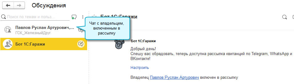 Через чат с владельцем можно переписываться, не выходя из программы 1С:Гаражи.