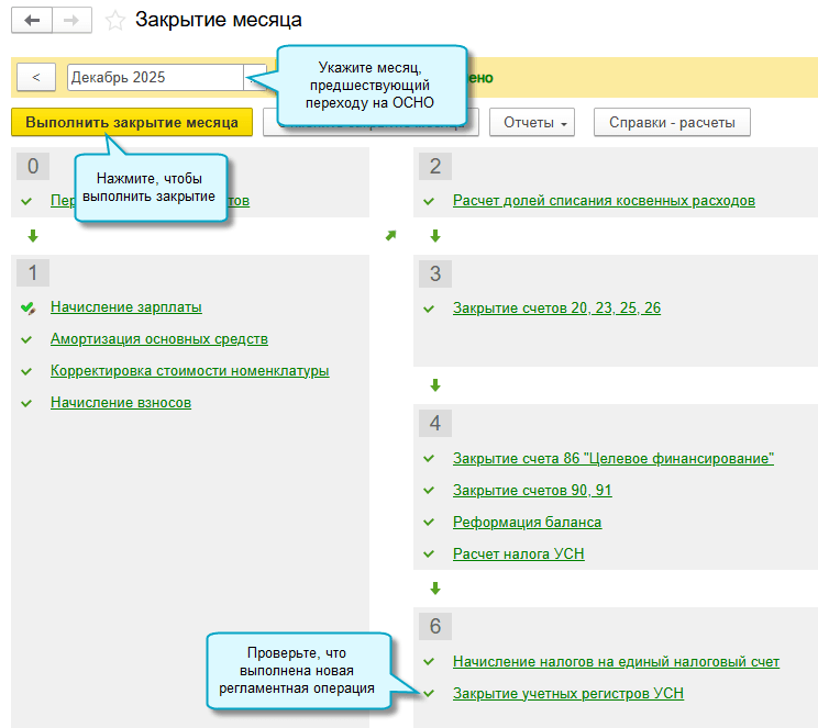 Простой интерфейс: меню "Бухгалтерия - Основное - Закрытие периода - Закрытие месяца - Закрытие учетных регистров УСН".