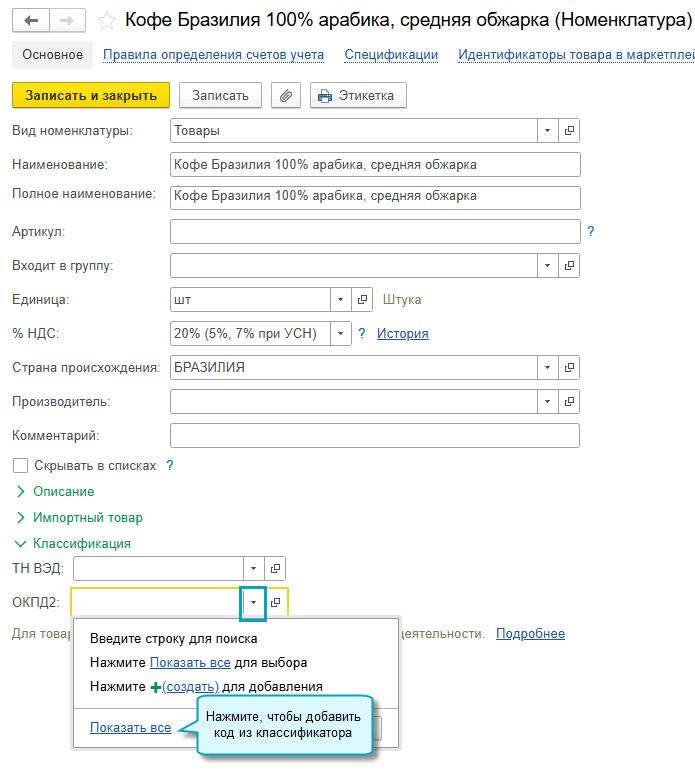 Рекомендуем подбирать код по ОКПД2 из актуального классификатора. Для облачных версий подбор кода из классификатора доступен без дополнительных настроек. Для локальных (коробочных) - достаточно быть подключенным к Интернет-поддержке пользователей.