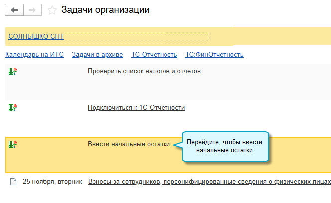 Теперь специальная задача организации напомнит о необходимости ввода остатков при начале учета в приложении.