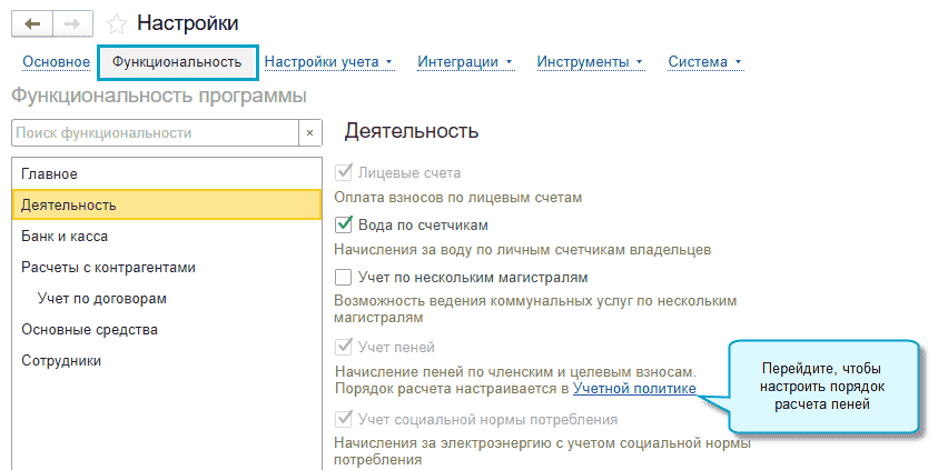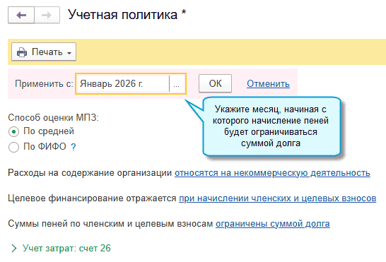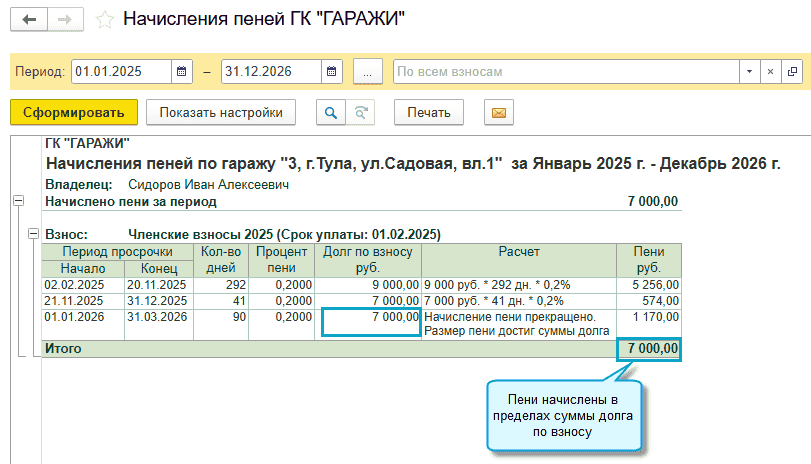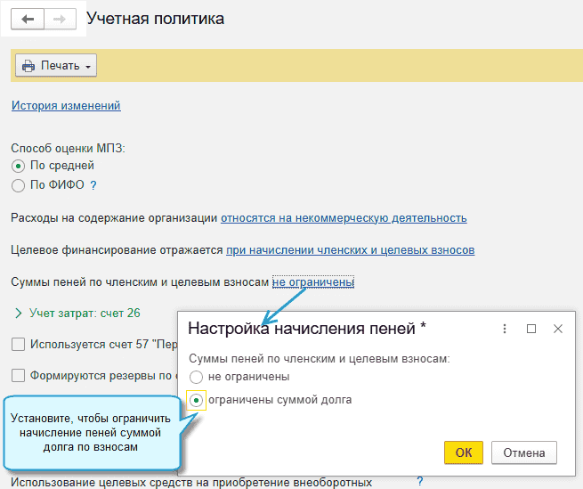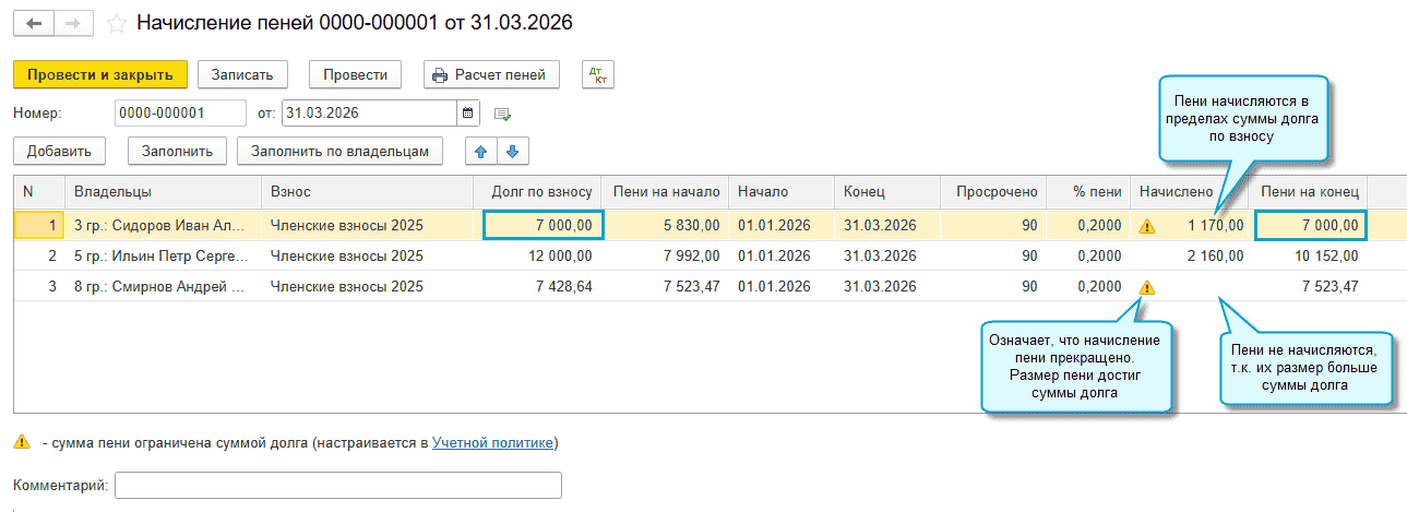 Добавлена возможность прекратить начисление пеней по членским и целевым взносам, когда их размер достиг суммы долга.