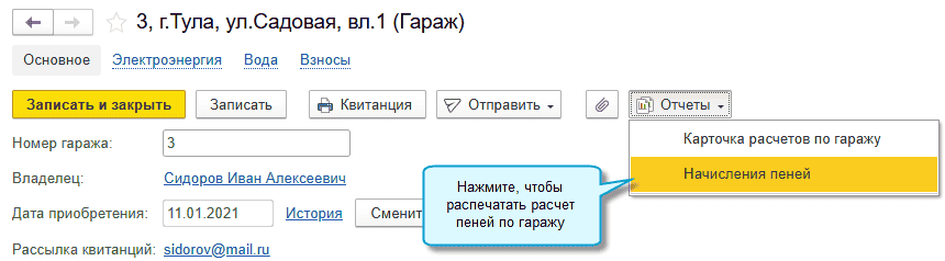 Простой интерфейс: меню "Расчеты - Пени".