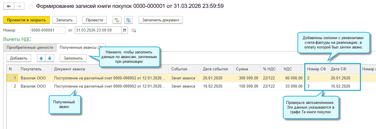 Добавлены графа 11а в книгу продаж и графа 7а в книгу покупок. Начиная с 01.01.2026 они заполняются у продавца, когда при реализации товаров, работ и услуг зачитывается аванс, ранее полученный от покупателя (Письмо ФНС от 26.12.2025 № СД-4-3/11730@). Подробнее ...