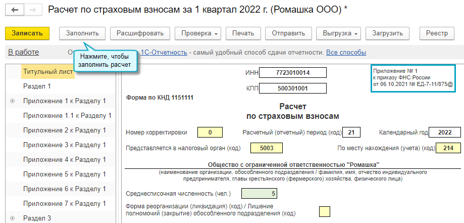 Добавлено автозаполнение расчета по страховым взносам согласно приказу ФНС России от 06.10.2021 № ЕД-7-11/875@. Форма применяется начиная с расчета за 1 квартал 2022 года.