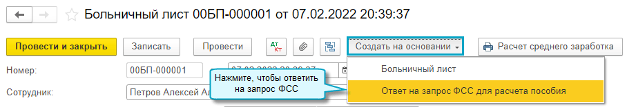 При поступлении входящего запроса ФСС введите больничный, а на основании больничного – ответ на запрос ФСС.