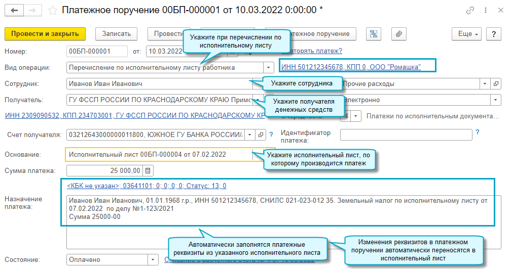 Добавлена возможность автоматического заполнения платежных реквизитов при перечислении денежных средств по исполнительным листам сотрудников. Подробные правила заполнения платежных поручений см. в приложениях к приказу Минфина от 12.11.2013 №107н в редакции приказа Минфина от 14.09.2020 №199н.