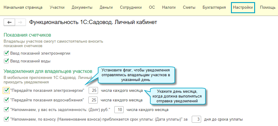 Добавлена возможность оповещать владельцев участков, пользующихся мобильным приложением 1С:Садовод. Личный кабинет: