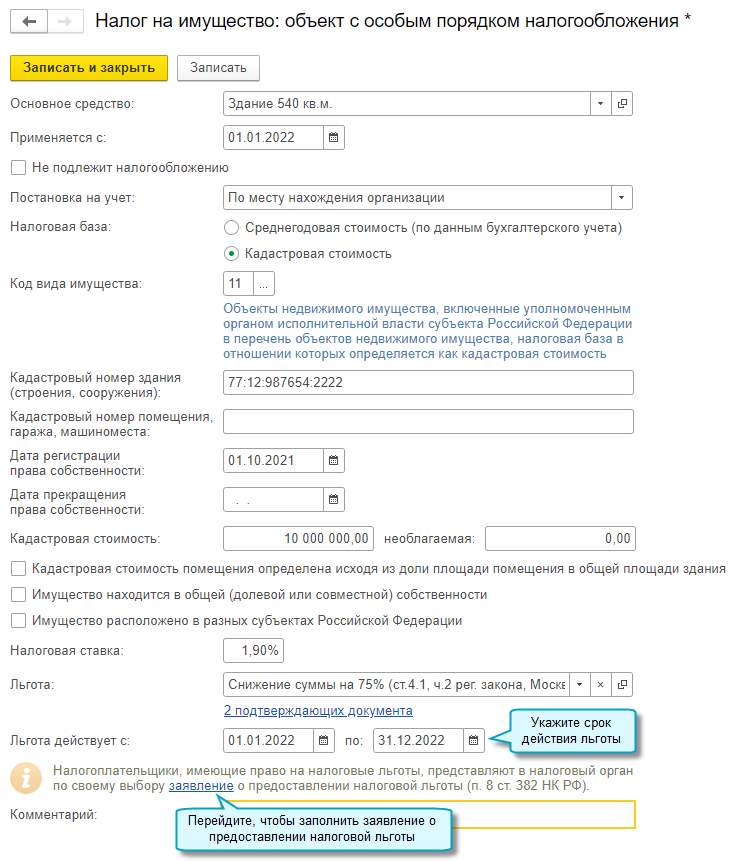 Добавлена возможность заполнить заявление о предоставлении налоговой льготы по налогу на имущество организаций. Заявление используется с 01.01.2022 при льготировании имущества, налог с которого рассчитывается по кадастровой стоимости (Приказ ФНС от 09.07.2021 № ЕД-7-21/646@).