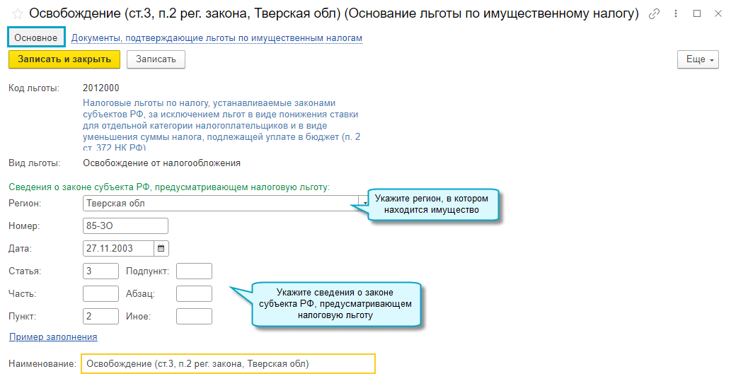 Добавлена возможность автозаполнения основания налоговой льготы в декларации по налогу на имущество, когда организация применяет региональную льготу, установленную законом субъекта РФ.