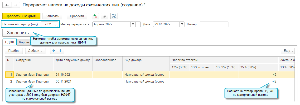 Добавлена возможность подготовить уточненную форму 6-НДФЛ за 2021 год в связи с отменой НДФЛ с материальной выгоды. Доходы в виде материальной выгоды (коды 2610, 2630, 2640, 2641), полученные в 2021 - 2023 годах, не облагаются НДФЛ (Федеральный закон от 26.03.2022 № 67-ФЗ).