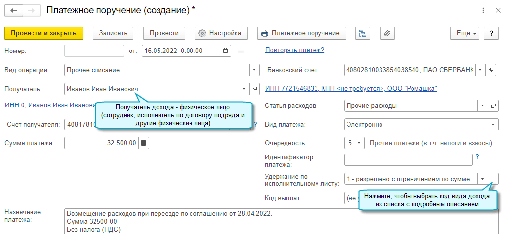 С 01.05.2022 изменены коды видов доходов для удержаний по исполнительным листам, которые указываются в платежных поручениях на перечисление физическим лицам заработной платы и других доходов. Теперь код вида дохода выбирается в зависимости от вида дохода (заработная плата, компенсация расходов по служебной командировке, оплата по договору подряда и др.) и характера выплат (единовременные или периодические). По коду дохода банком определяется возможность удержания с физического лица сумм по исполнительным листам (Указание Банка России от 25.03.2022 № 6104-У).