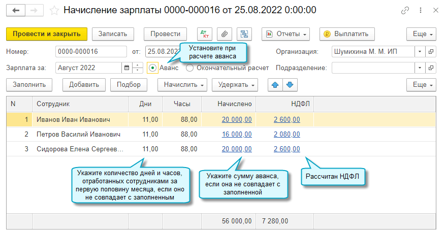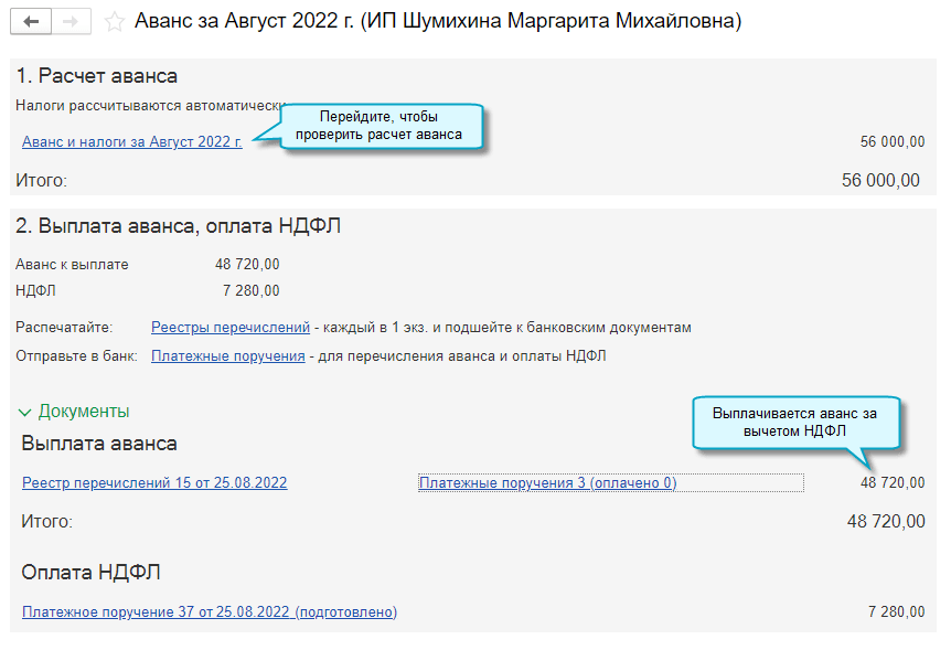 Для расчета аванса в этом случае используется документ Начисление зарплаты с видом операции Аванс. В бухгалтерском учете начисление аванса не отражается.