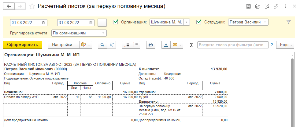 Простой интерфейс: меню "Сотрудники - Основное - Отчеты - Все отчеты... - Зарплата - Расчетный листок (за первую половину месяца)".