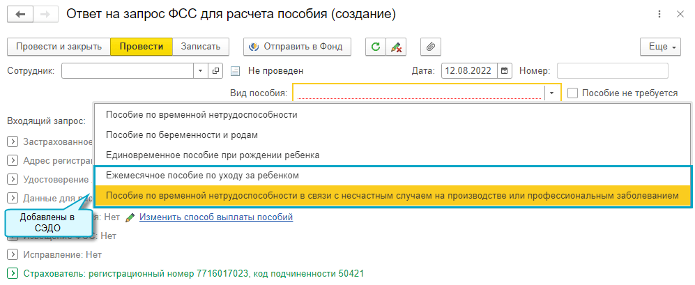 Добавлена возможность обмена с ФСС через СЭДО по ежемесячному пособию по уходу за ребенком и пособию по временной нетрудоспособности в связи с несчастным случаем на производстве или профессиональным заболеванием. Запросы по ним поступают во Входящие запросы ФСС для расчета пособий.