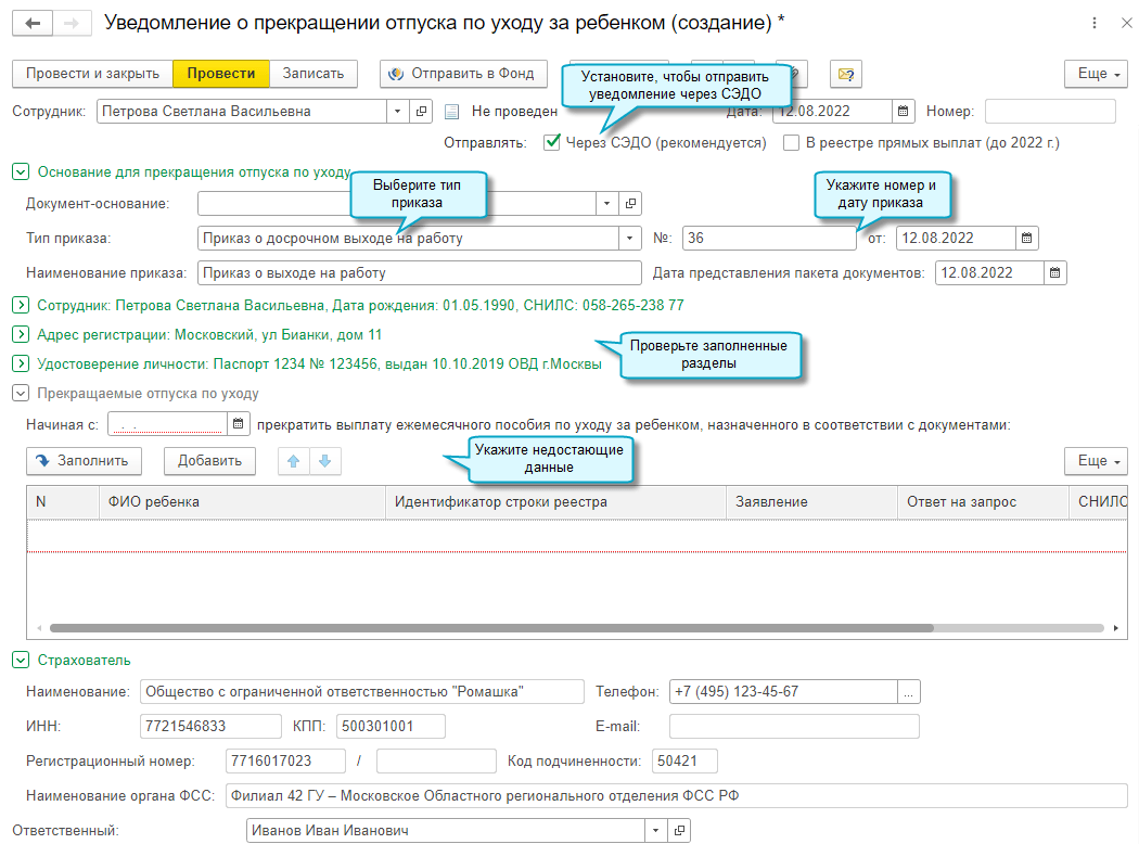 Добавлена возможность отправить в ФСС через СЭДО Уведомление о прекращении отпуска по уходу за ребенком до полутора лет. Для этого используется документ Уведомление о прекращении отпуска по уходу за ребенком. Результат обработки ФСС уведомления поступит также через СЭДО.
