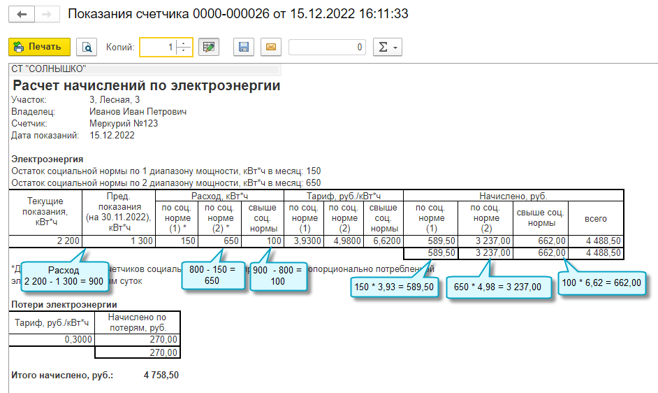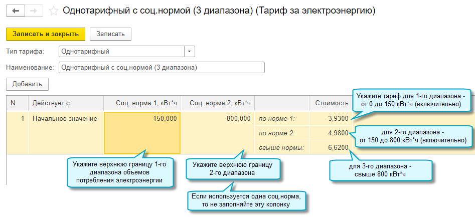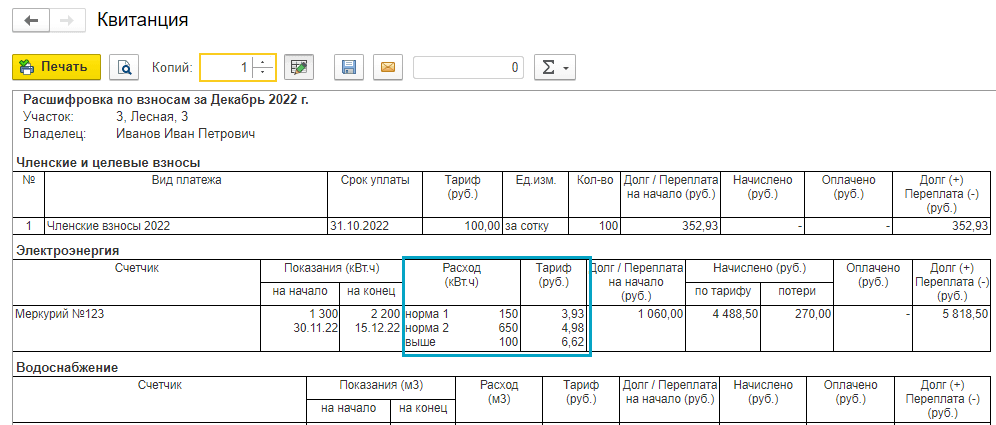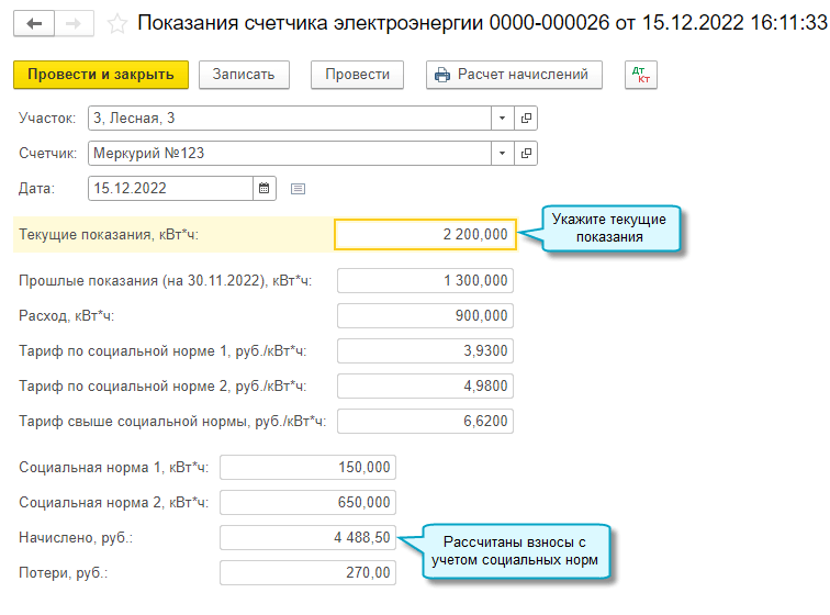 Добавлена возможность начислять взносы за электроэнергию по тарифам, установленным для трех диапазонов объемов потребления электроэнергии (мощности).