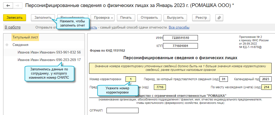 Добавлено заполнение уточненных Персонифицированных сведений о физических лицах, когда вносятся изменения в ранее отправленные сведения (Приказ ФНС России от 29.09.2022 № ЕД-7-11/878@).
