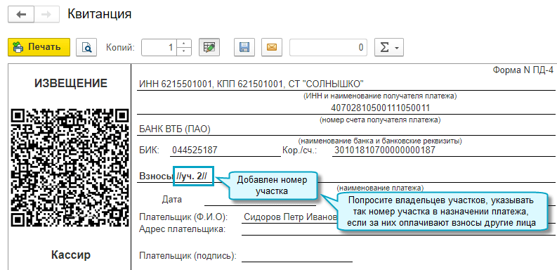Добавлена возможность при загрузке банковской выписки автоматически определять оплаченный участок для тех случаев, когда взносы делает не владелец. Для этого потребуется в назначении платежа указать номер участка в формате "//уч. НОМЕР УЧАСТКА//". Этот номер теперь выводится в печатной форме квитанции на оплату.