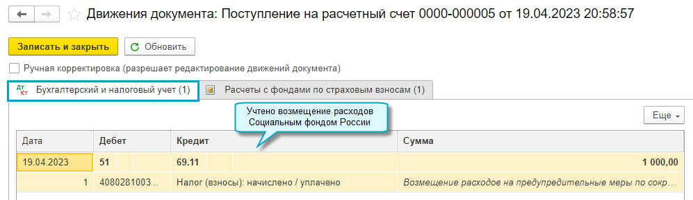 Добавлена возможность учитывать поступление из Социального фонда России возмещения расходов на оплату дополнительных выходных дней для ухода за детьми-инвалидами, на выплату пособия на погребение, на финансирование предупредительных мер по сокращению производственного травматизма и других расходов.