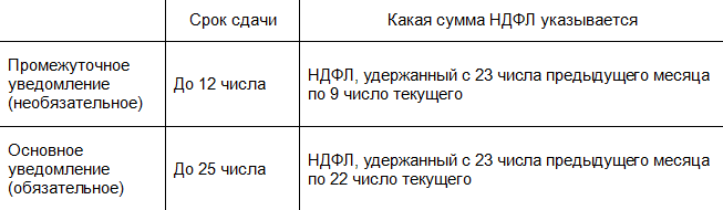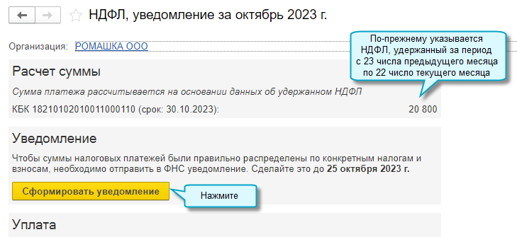 Добавлена возможность подготовить уведомление об исчисленных суммах налогов на НДФЛ, удержанный за период с 23 числа предыдущего месяца по 9 число текущего месяца. Такие промежуточные уведомления можно в добровольном порядке отправлять в ФНС с 1 октября 2023 г. по 31 декабря 2023 г. (Федеральный закон от 31.07.2023 № 389-ФЗ).