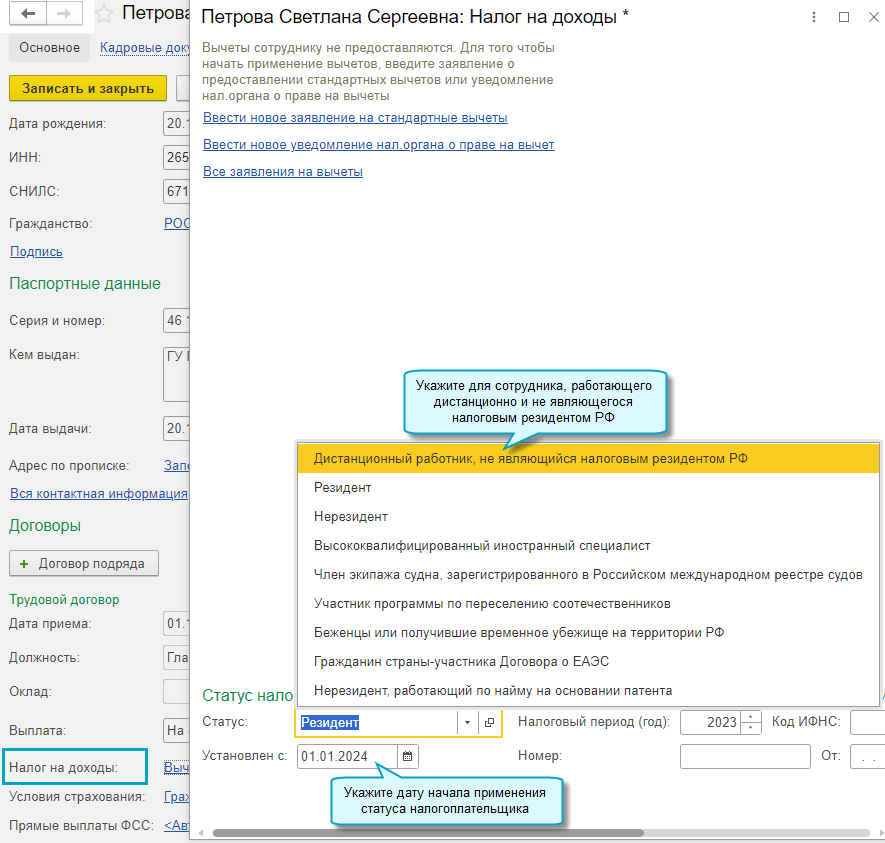 Для удержания НДФЛ с зарплаты дистанционных работников, не являющихся налоговыми резидентами РФ, потребуется выполнить следующую настройку: