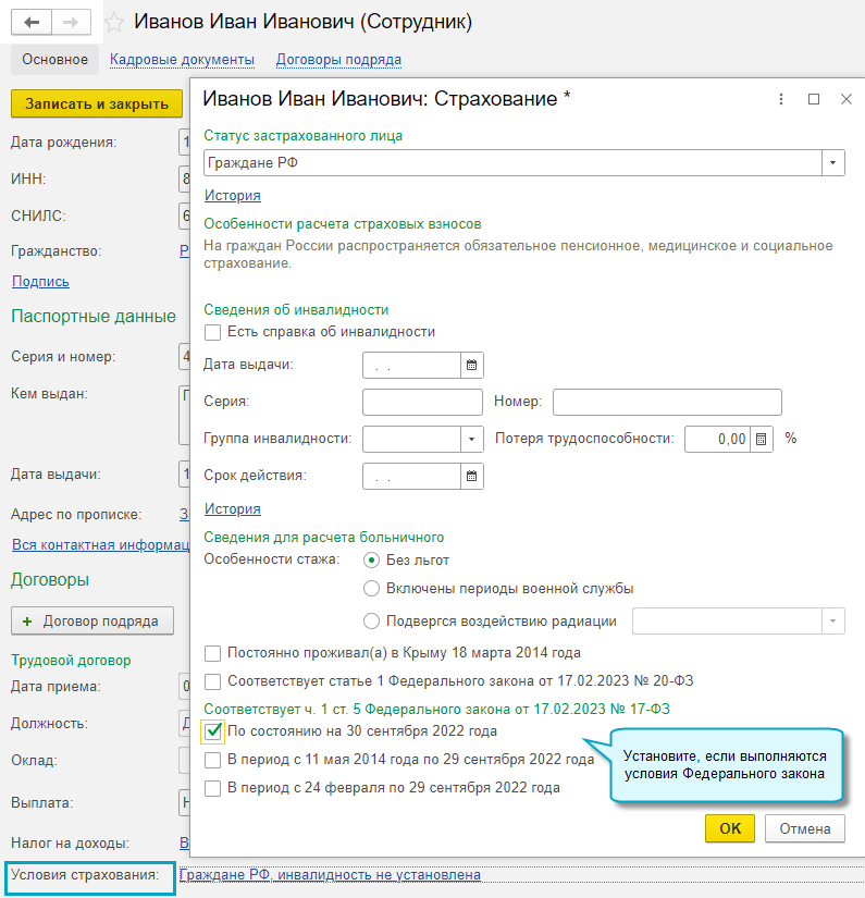 Добавлена возможность в форме СЗВ-К заполнить особенности пенсионного обеспечения согласно Федеральному закону от 17.02.2023 № 17-ФЗ. Для этого потребуется выполнить следующую настройку: