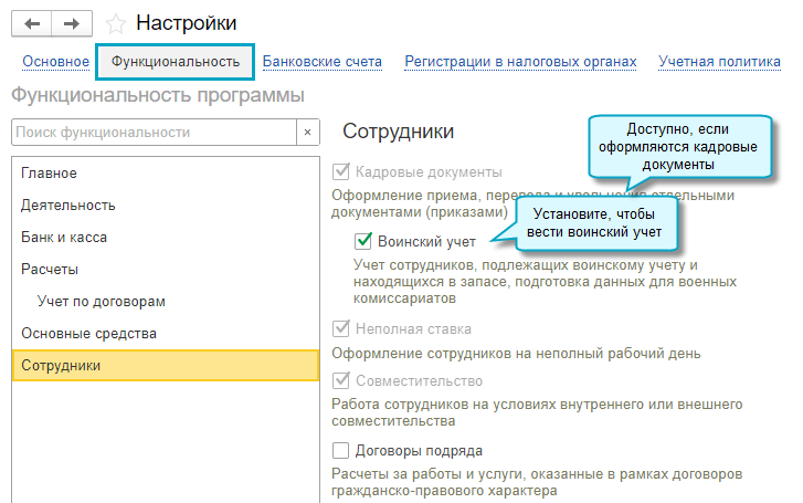 Добавлена возможность вести учет сотрудников, подлежащих воинскому учету и находящихся в запасе, и готовить отчеты для военных комиссариатов. Функционал недоступен, когда учет расчетов по зарплате и кадровый учет ведутся во внешней программе.