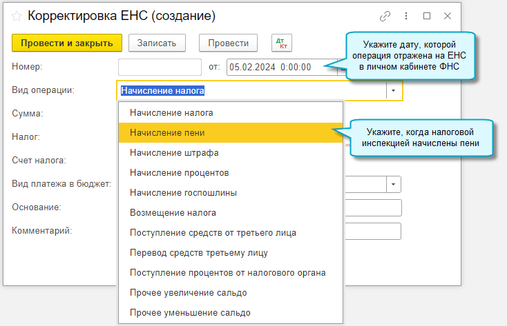Используйте новый документ "Корректировка ЕНС", чтобы отразить на ЕНС налоги, которые рассчитываете вручную: