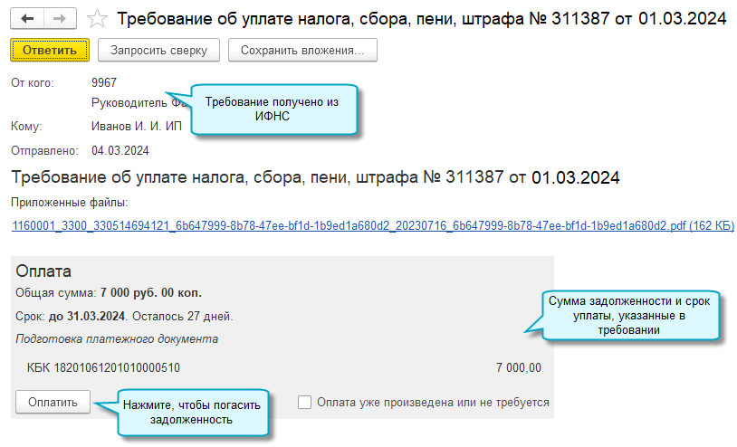 Добавлена возможность оплатить задолженность по налогам и взносам сразу при получении требований ФНС на ее погашение.