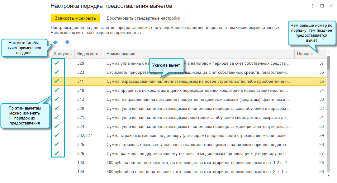 Добавлена возможность настроить порядок предоставления вычетов по НДФЛ по уведомлениям ФНС о праве на вычеты. Например, имущественные вычеты на приобретение жилья предоставлять в последнюю очередь, поскольку их неиспользованный остаток переносится на следующий год, в отличие от социальных.